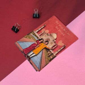 A beautifully illustrated romantic greeting card featuring a couple in traditional attire with the Taj Mahal backdrop. Perfect for anniversaries, weddings, Valentine’s Day, or just to express love in a special way.